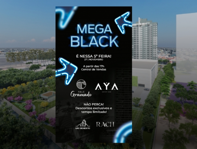 A Mega Black Friday da São Benedito também oferece condições especiais para o AYA, empreendimento recém-lançado na região do Bosque da Saúde, cujas últimas unidades permanecem disponíveis.